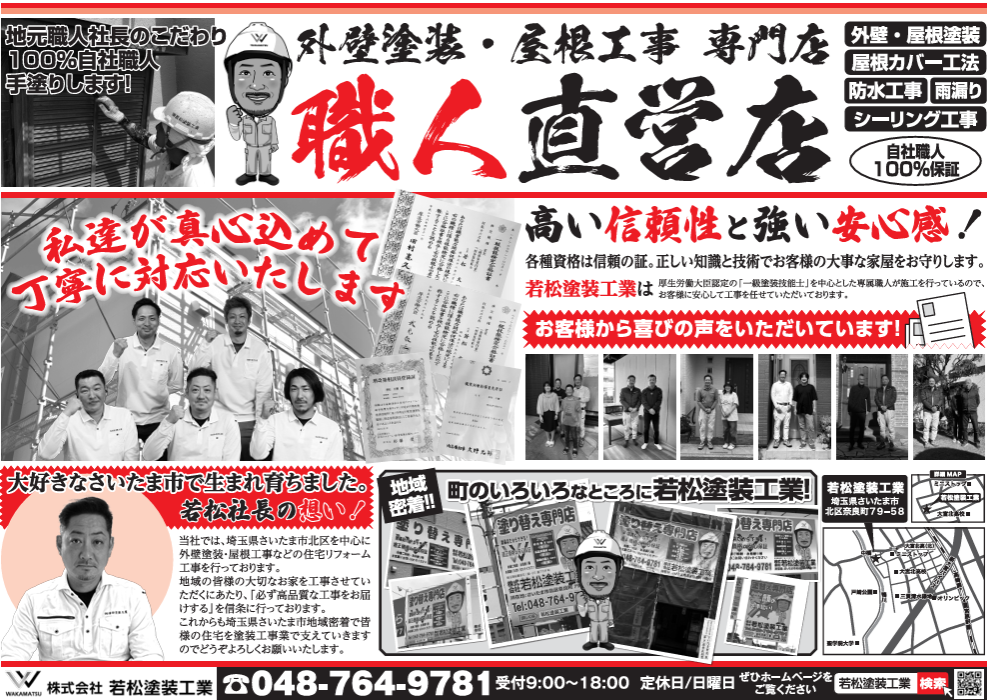 この度は、数あるホームページの中から、埼玉県さいたま市北区にあります株式会社若松塗装工業のホームページをご覧いただきまして誠にありがとうございます。